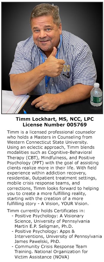 Timm Lockhart, a Licensed Professional Counselor based in Sandy Hook, provides a practical, results-driven approach for overcoming depression, anxiety, and substance use challenges. His therapeutic process begins at the root of real change—your thoughts. Together, you will identify and challenge unhelpful patterns, empowering you to intentionally choose paths that serve your well-being. This collaborative journey creates a clear vision, sharpening your focus and perspective, while guiding purposeful actions toward a future defined by your choices, not constraints. It's about reclaiming control—embracing a life filled with love and intention.